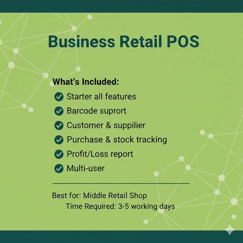 Business Retail POS is a feature-rich point-of-sale solution designed for medium-sized retail shops that require advanced sales tracking, inventory control, and multi-user operations. It is ideal for businesses with higher daily transactions and multiple staff members.