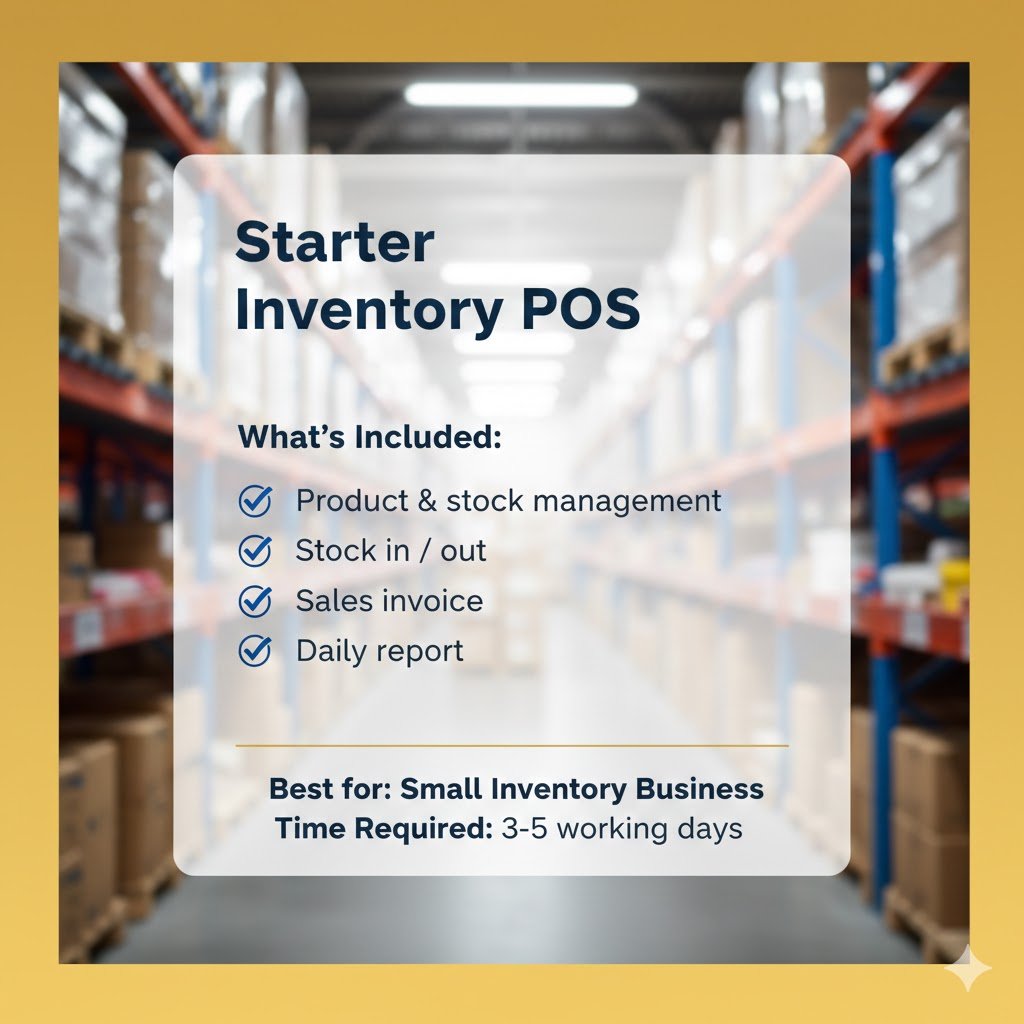 Starter Inventory POS is a simple and user-friendly point-of-sale system designed for small inventory-based businesses. It helps manage products, track stock movements, generate invoices, and monitor daily sales, making inventory operations smooth and organized.